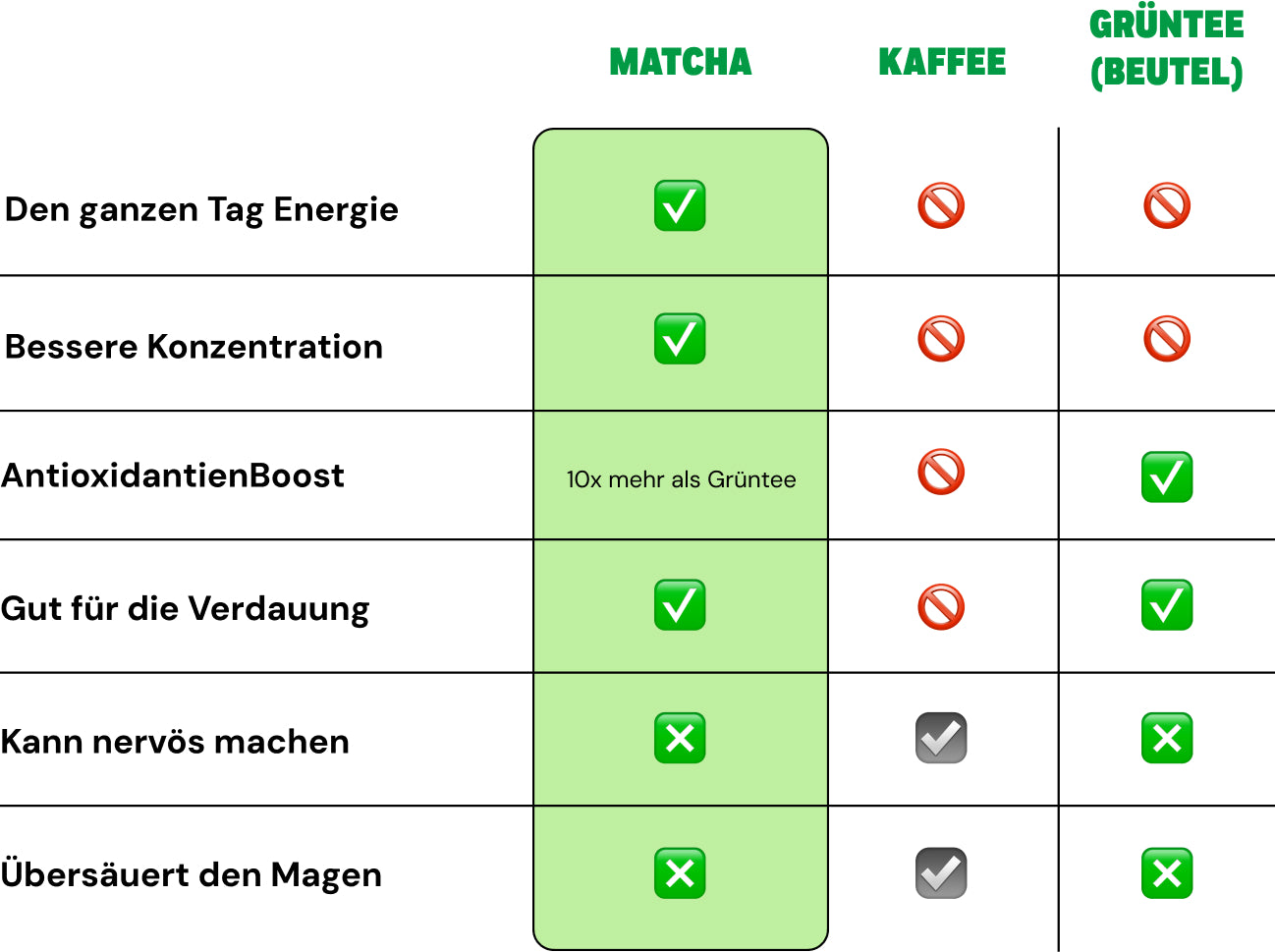 Matcha Pulver hat die 10-fache Menge an Antioxidantien im Vergleich zu einer normalen Tasse Grüntee (zum Glück kostet es nicht das 10-fache) und so viel Koffein wie eine Tasse Kaffee.