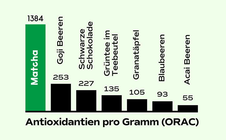 Matcha Pulver hat die 10-fache Menge an Antioxidantien im Vergleich zu einer normalen Tasse Grüntee (zum Glück kostet es nicht das 10-fache) und so viel Koffein wie eine Tasse Kaffee.